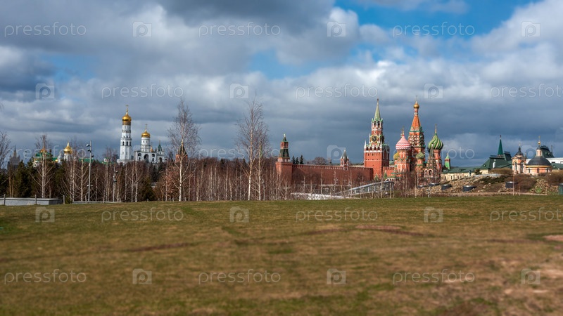 Живописная панорама парка Зарядье с видом на собор Василия Блаженного и Московский Кремль, Россия. Вид на достопримечательности Москвы весной. Красивые пейзажи Центрального парка Москвы