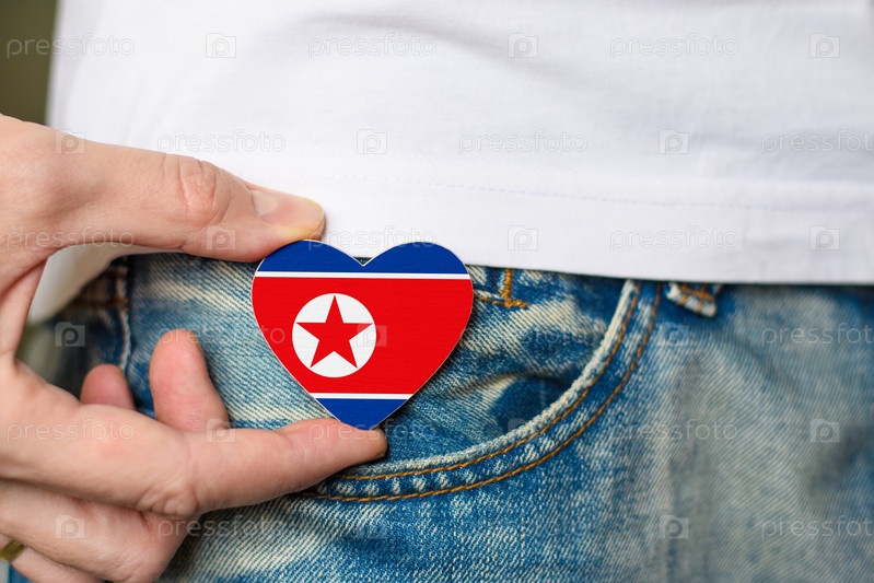 Житель Северной Кореи. Деревянный значок с флагом Северной Кореи в форме сердца в мужской руке