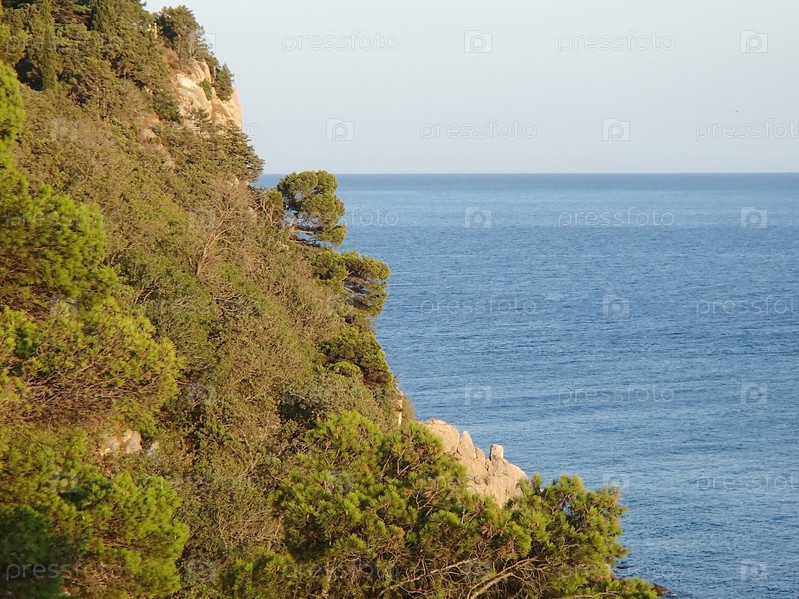Море и скалы, заросшие вечнозелеными соснами. Крымский пейзаж. Мыс Ай-Тодор