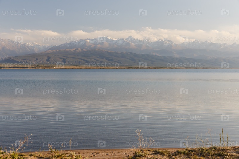 Южный берег озера Иссык-Куль в Кыргызстане, чистая вода в озере и горы со снежными вершинами на заднем плане