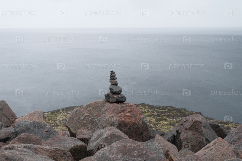 Пирамида из камней у океана. Море в тумане
