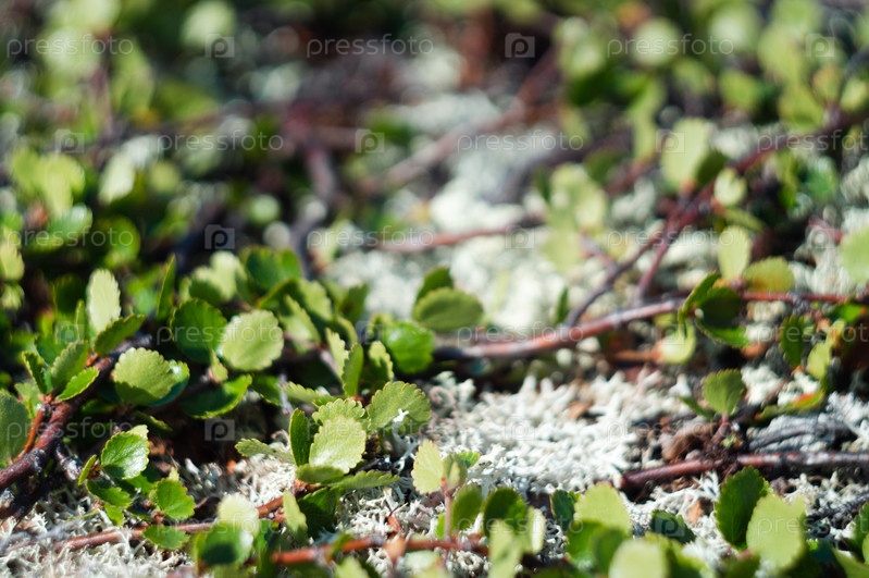 Карликовая береза крупным планом. Мох ягель, северная растительность тундры крупным планом