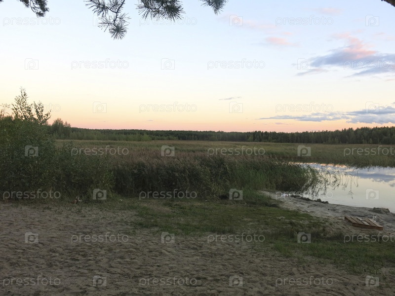 Воды тихого озера с песчаным пляжем на закате