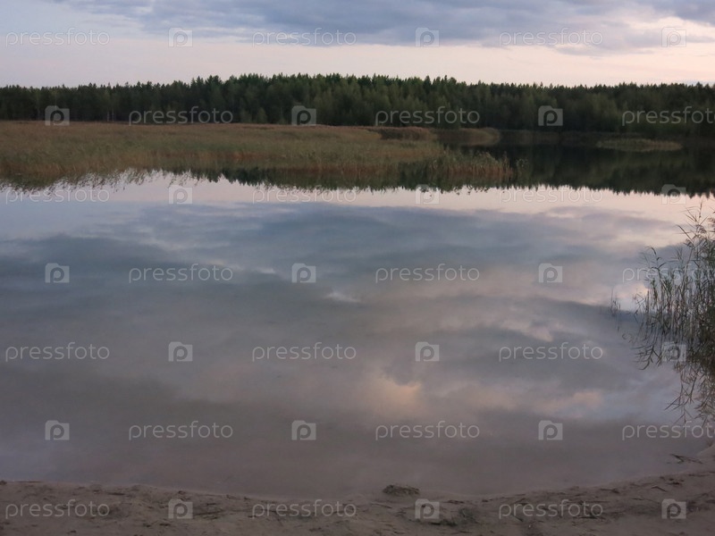 Воды тихого озера с песчаным пляжем на закате