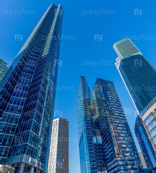 МОСКВА, РОССИЯ - 02 февраля 2021 г.: Москва в солнечный зимний день. Деловой район Москвы в синих тонах зимних огней. Солнечный день в большом городе