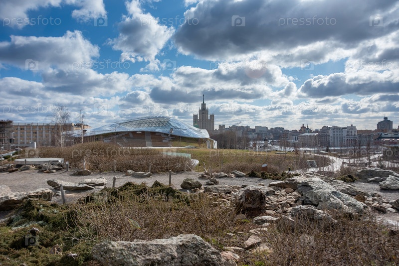 Живописная панорама парка Зарядье с видом на собор Василия Блаженного и Московский Кремль, Россия. Вид на достопримечательности Москвы весной. Красивые пейзажи Центрального парка Москвы