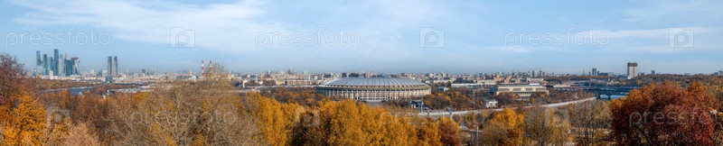 Москва, Россия - 11 октября 2021 г.: Панорамный вид на стадион "Лужники" с Воробьевых гор на фоне городских пейзажей в осенний солнечный день