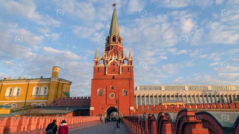 МОСКВА, РОССИЯ - 22 ноября: Многие туристы направляются в Кремлевский дворец через Троицкую башню 22 ноября 2014 года в Москве, Россия. Башня находится в центре северо-западной стены Кремля и была построена в 1495 году