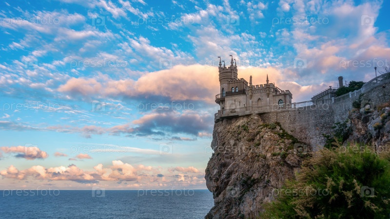 Замок Ласточкино гнездо на скале над Черным морем крупным планом, Крым, Ялта. Одна из самых популярных туристических достопримечательностей Крыма