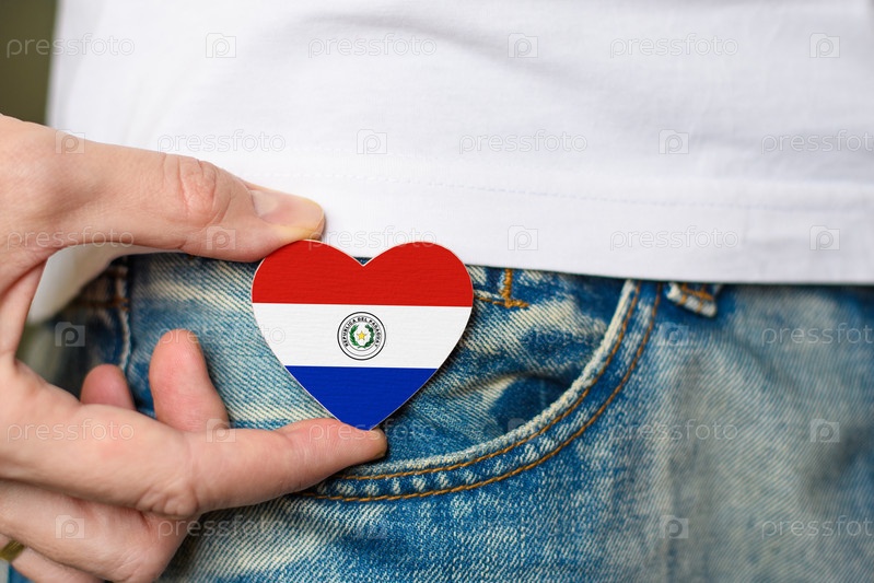 Деревянный значок с флагом Парагвая в форме сердца в мужской руке. Концепция парагвайского патриотизма