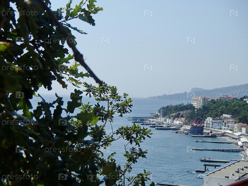 Спокойное море, полный штиль. Пляжи, море, горы. Прибрежная полоса Гаспры. Крымский пейзаж
