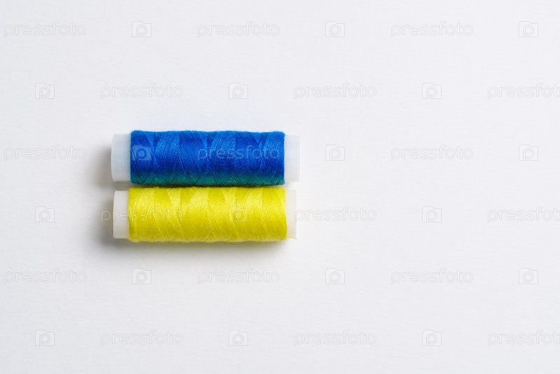 Две катушки ниток для шитья сложены в виде флага Украины на белом фоне. Концепция украинского патриотизма и швейная промышленность страны. Есть свободное пустое место