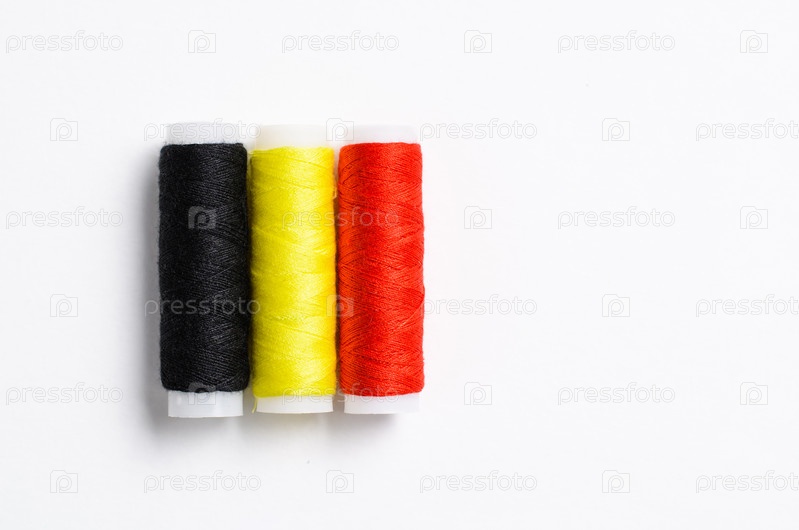 Три катушки ниток для шитья сложены в виде флага Бельгии на белом фоне. Есть свободное пустое место