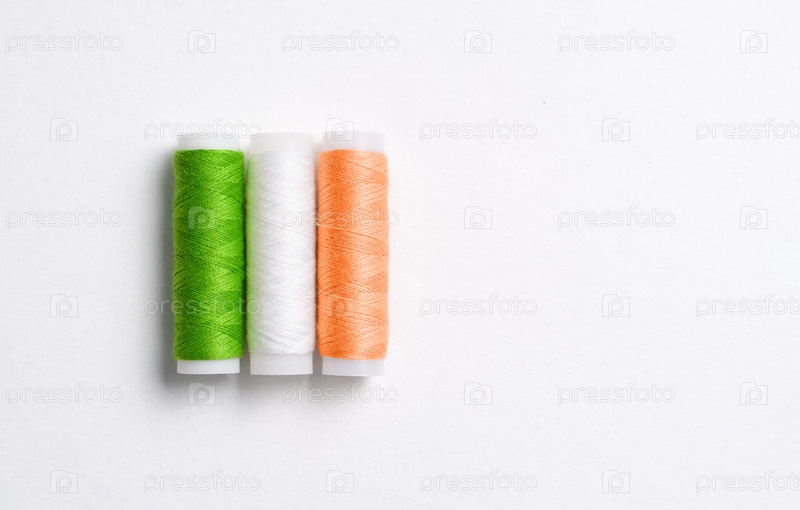 Разноцветные катушки ниток для шитья, сложенные в виде флага Ирландии на белом фоне. Есть свободное пустое место