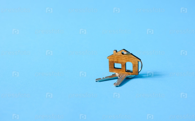 Маленькая фигурка дома с ключами от замка на синем фоне. Концепция покупки собственного дома