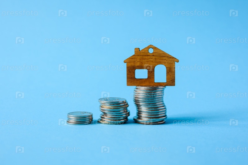 Маленькая фигурка дома стоит на стопке монет. Концепция сбережений на покупку дома
