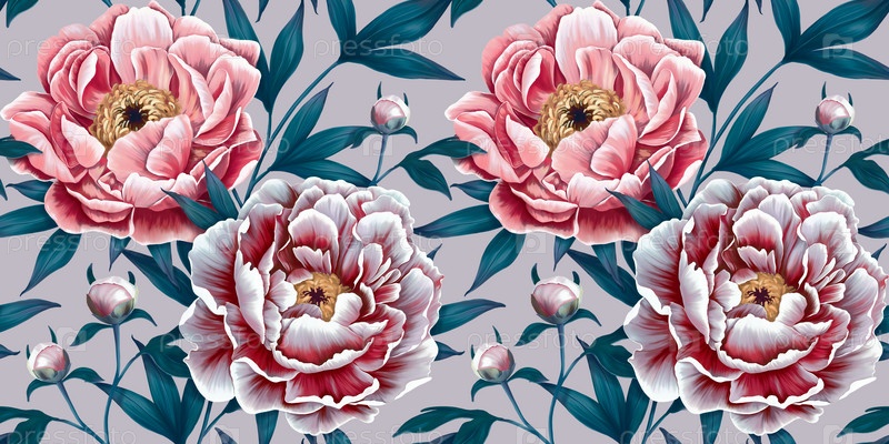 Цветочный бесшовный узор. Ботанические обои с реалистичными пионами, темный фон. Винтажные рисованные цветы, бутоны, листья для обоев, ткани, оберточная бумага, баннеры, блоги, социальные сети