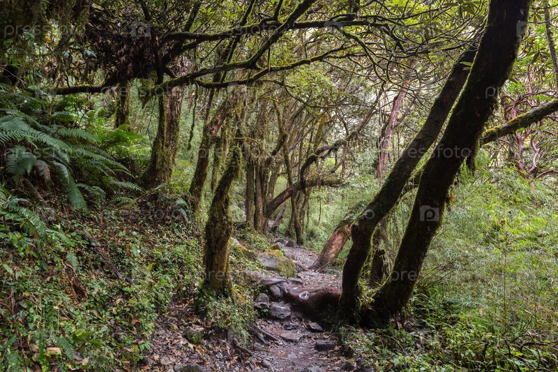 Каменная тропинка в зеленых тропических джунглях. Тропический лес в Непале, Гималаи