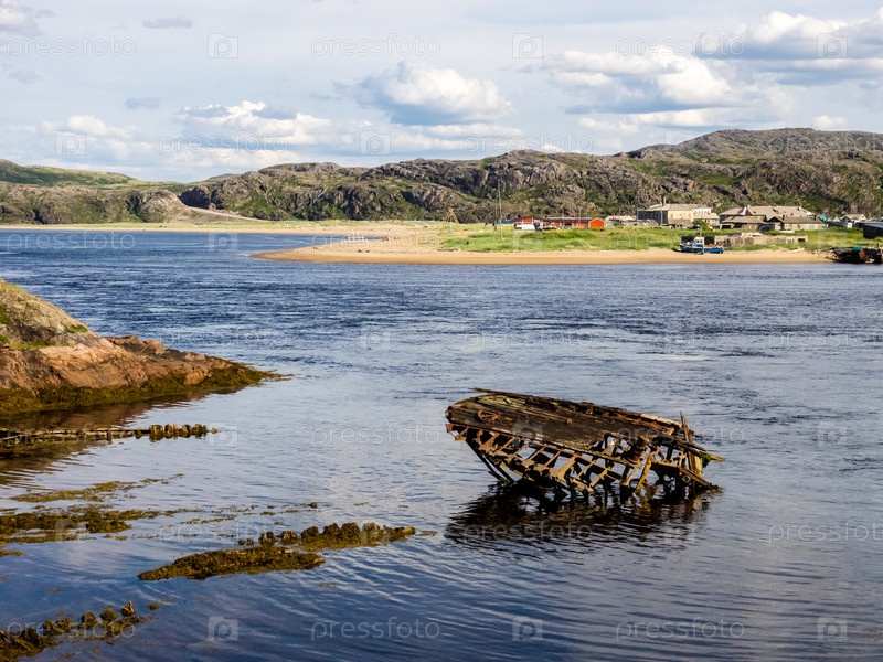 Затонувшая старая деревянная рыбацкая лодка в Териберке, Мурманская область, Россия