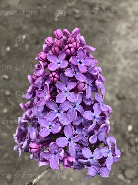 Цветущая ветка сирени на фоне земли