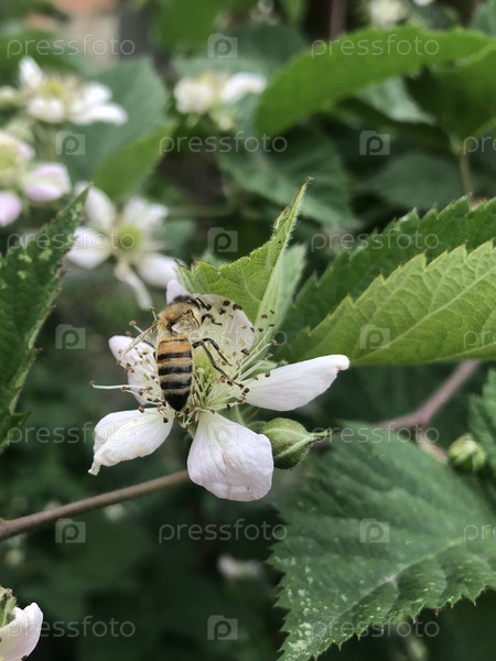 Пчела сидит на распустившимся цветке ежевики