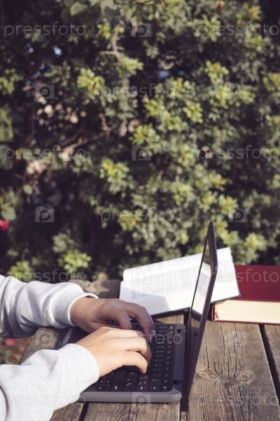 Деталь руки, пишущей на ноутбуке с копировальным пространством