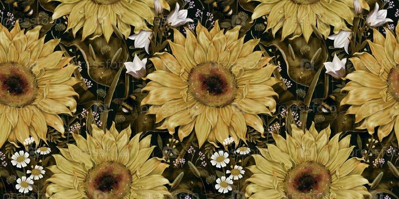 Бесшовный рисунок с желтыми подсолнечками, белыми колокольчиками, ромашками, шмелями. Темные цветочные обои. Ручное изображение, 3D-иллюстрация. Летние полевые цветки. Роскошный дизайн для обоев, текстиля, одежды