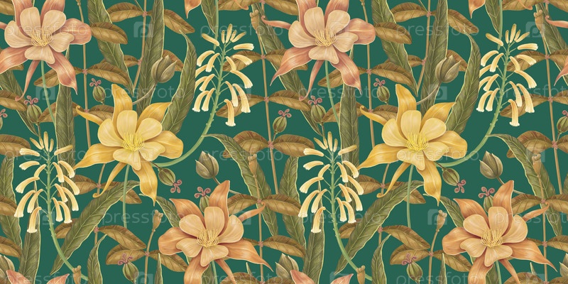 Ботанический бесшовный рисунок с разными цветами. Старинный цветочный фон. Цветы и травы обои. Ручной рисунок иллюстрации. Используется для печати на ткани, обоях, товарах