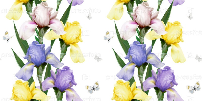 Бесшовный рисунок цветочного орнамента ирисов и бабочек на светлом фоне. Акварельная иллюстрация, ручной рисунок. Цветочный фон. Роскошные обои, печать на ткани, ткань, бумага, фреска