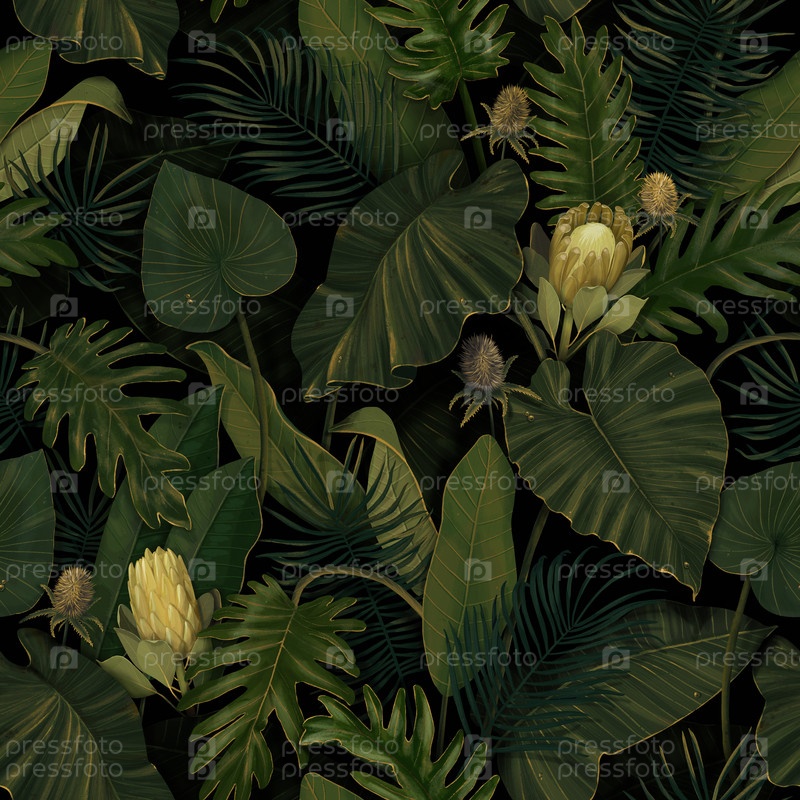Бесшовный узор из овощей. Тропический лес, джунгли. Цветы протеи, пальмовые листья, монстера, колоказия, банан