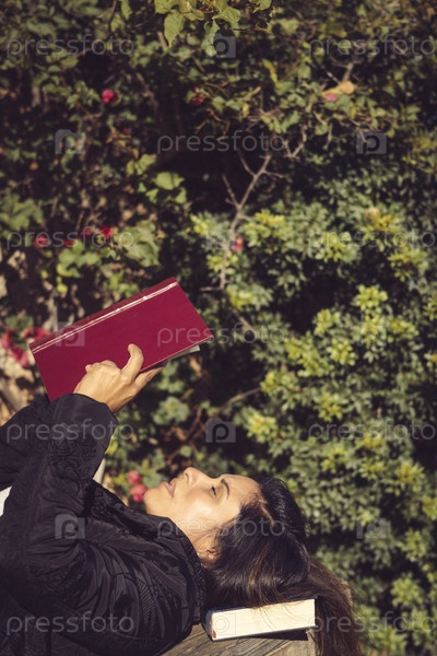 Красивая женщина, читающая в саду, лежащая на деревянном столе, занимает вертикальное пространство на переднем плане,