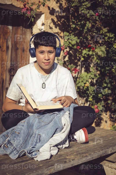 Молодой студент читает и слушает музыку, сидя за деревянным столом в саду дома, фото спереди, половина тела в вертикале, глядя в камеру