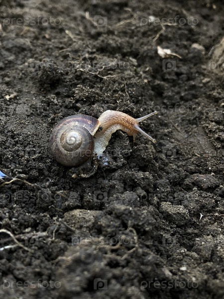 Улитка на грунте перебирается через бугорок земли