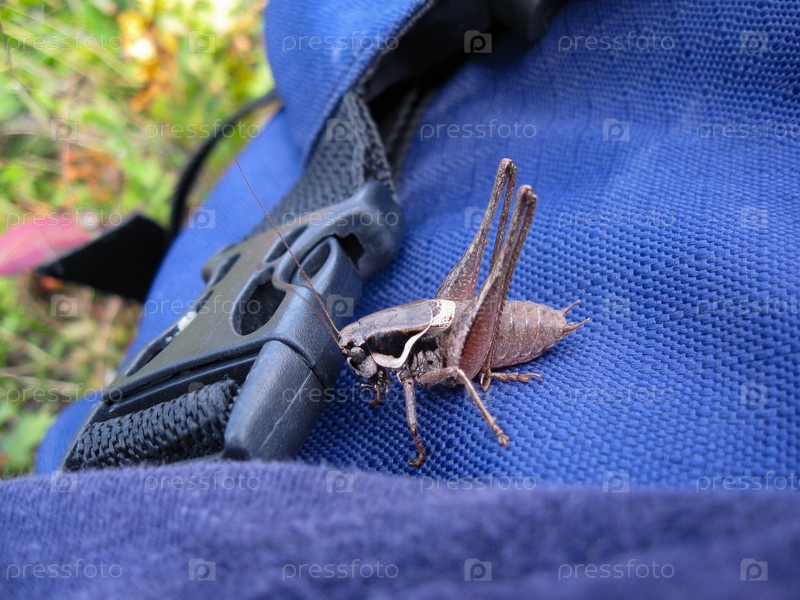 Кузнечик сидит на рюкзаке