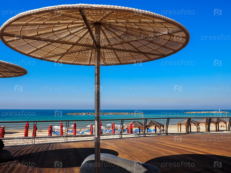 Соломенные зонтики в солнечный летний день на пляже Тель Барух в Тель-Авиве, Израиль