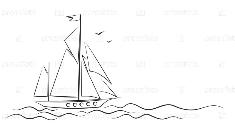 Набросок парусной лодки в море с птицами