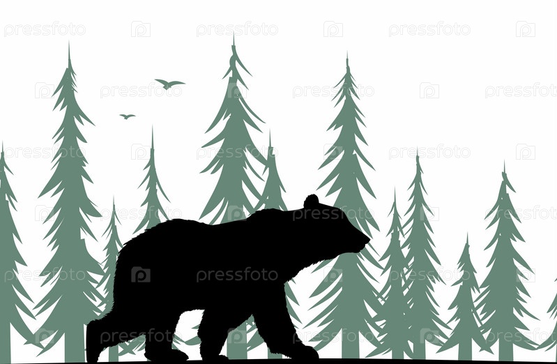 Силуэт медведя с зеленым хвойным лесом