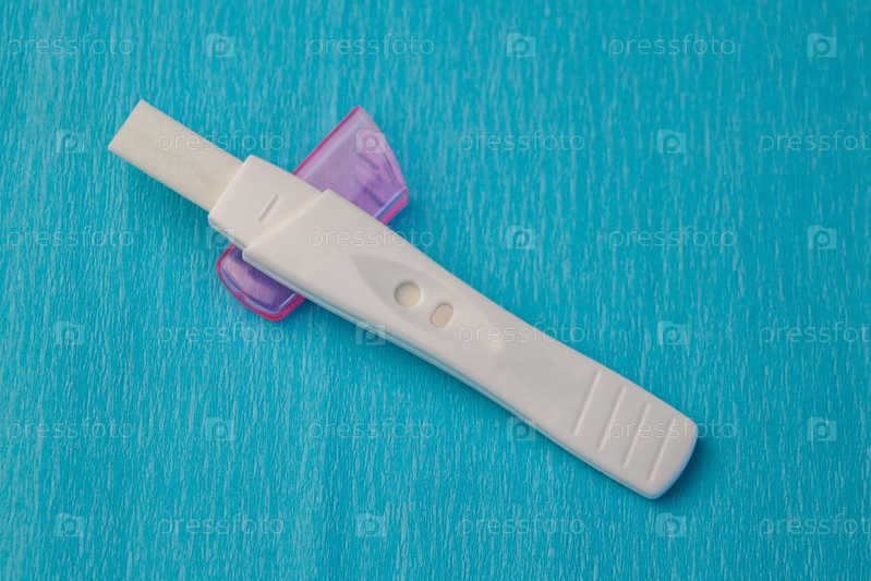 Белый тест на беременность с розовой крышкой на голубом фоне