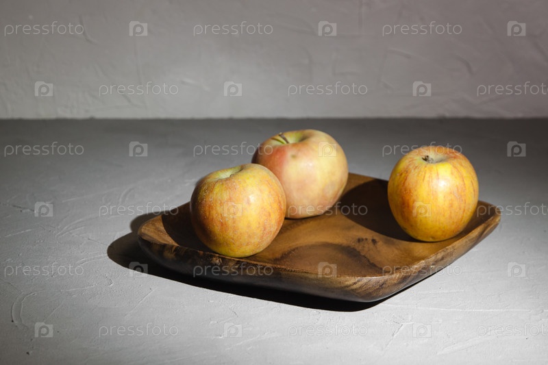 Спелые яблоки на деревянной тарелке. Сбор спелых яблок. Концепция урожая