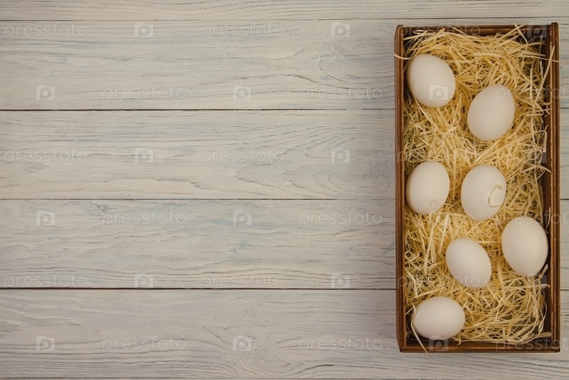 Деревянная коробка с соломой и семью куриными яйцами стоит на синем деревянном фоне. Вид сверху