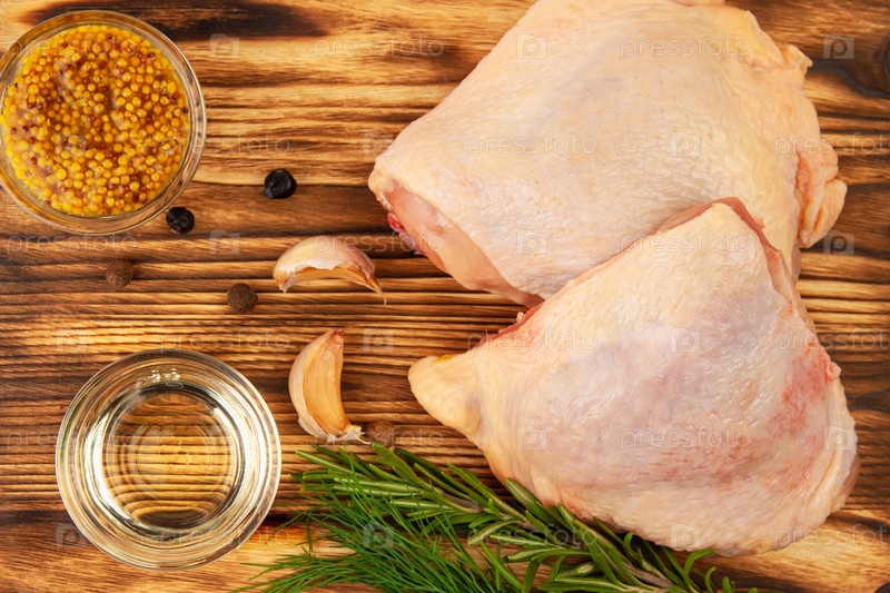 Сырые куриные бедра с зеленью, чесноком, горчицей, перцем и маслом на деревенской деревянной доске