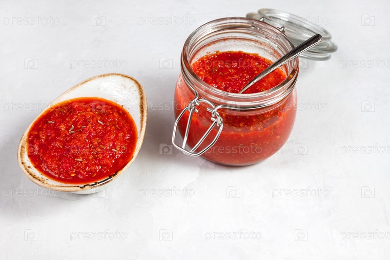 Паста из острого перца чили харисса. Аджика. Традиционная тунисская, грузинская и арабская кухня. Домашняя розовая харисса в миске
