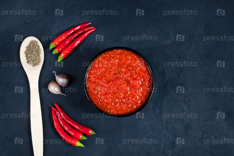 Паста из острого перца чили харисса. Аджика на голубом фоне. Традиционная тунисская, грузинская и арабская кухня
