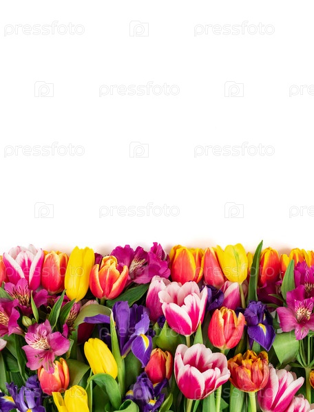 Граница с красочными весенними цветами. Цветочная композиция изолирована на белом фоне. День матери и весенняя концепция. Скопируйте пространство, вид сверху, плоская планировка