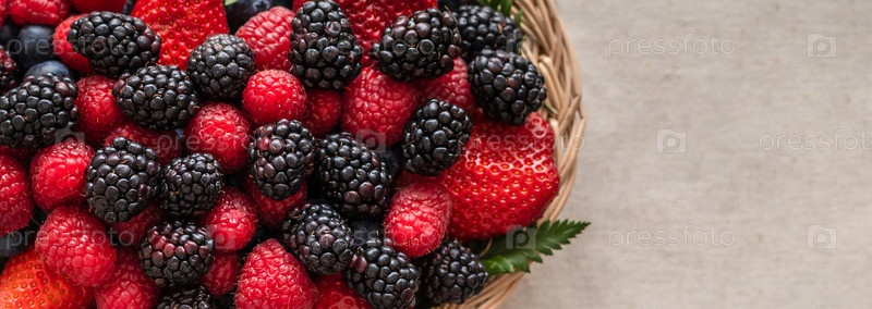 Ягоды на бежевом фоне. Ягодный микс крупным планом. Баннер. Малина, ежевика и клубника в корзине. Скопируйте пространство, вид сверху