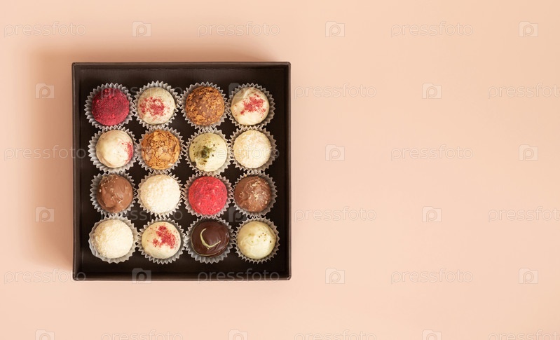 Трюфели в коробке на розовом фоне. Различные конфеты или энергетические шарики. Домашние сладости. Скопируйте пространство, вид сверху
