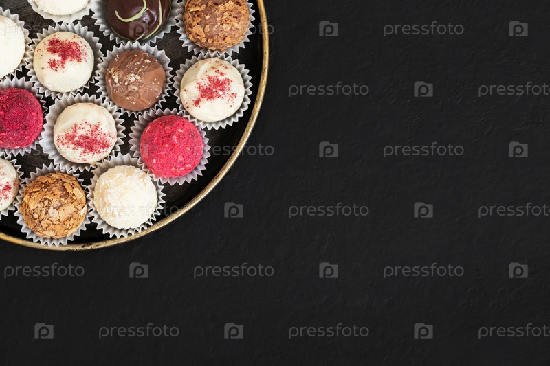 Ассорти из трюфелей в тарелке на черном фоне. Домашние конфеты или энергетические шарики с сухофруктами и шоколадом. Суперфуд. Скопируйте пространство, вид сверху, плоская планировка