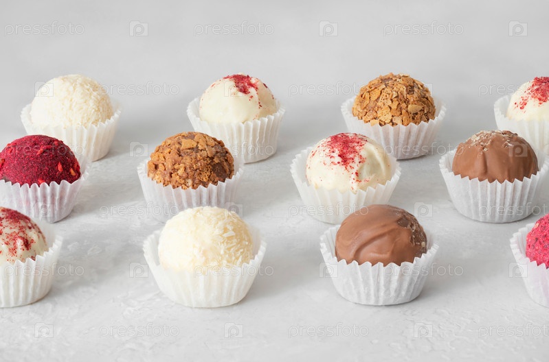 Домашние трюфели на белом фоне. Конфеты или энергетические шарики с шоколадом, кокосом, орехами, каркаде и сухофруктами. Здоровое питание