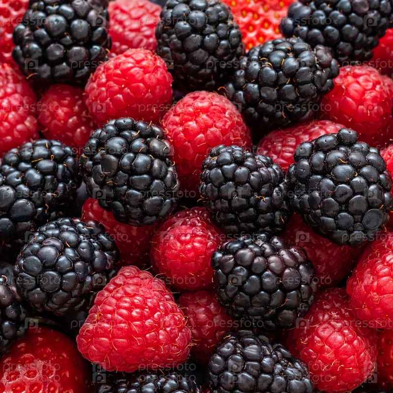 Малина и ежевика крупным планом. Ягодный фон. Вид сверху, плоская планировка. Ягодный узор
