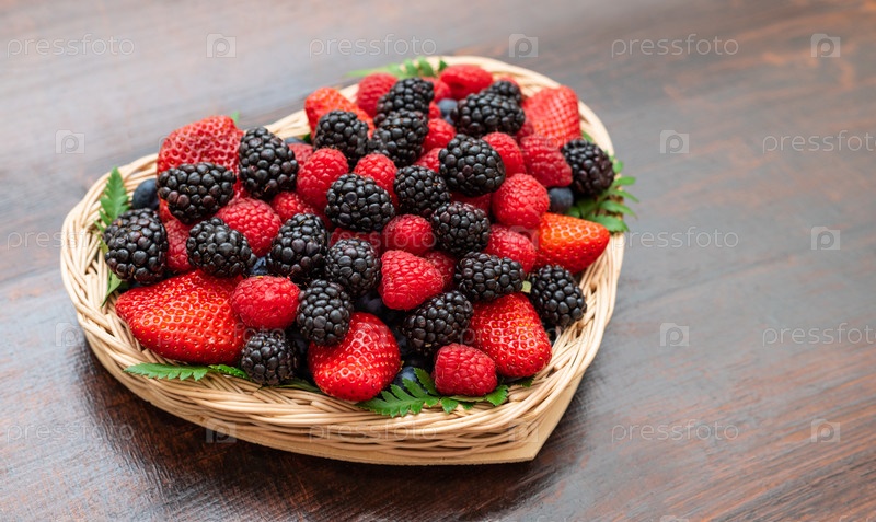 Ягоды в корзине в форме сердца. Малина, ежевика и клубника в корзине на деревянном фоне. Ягодный микс